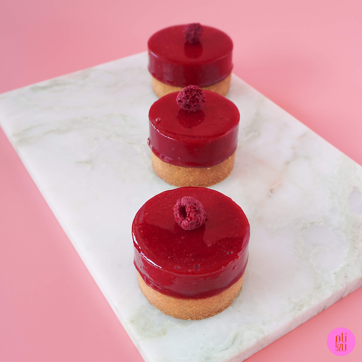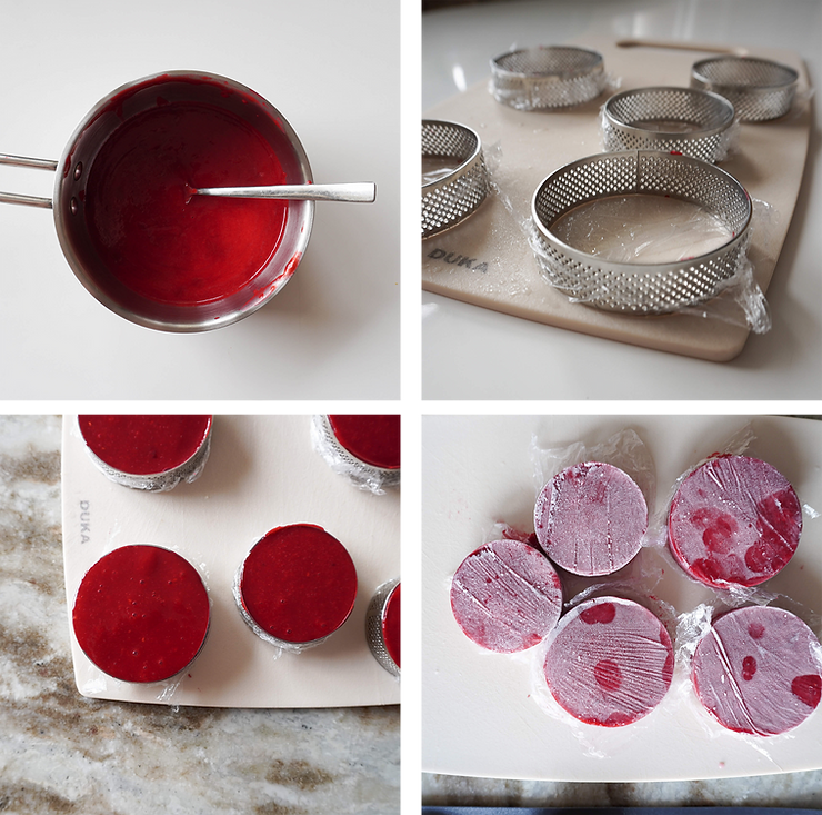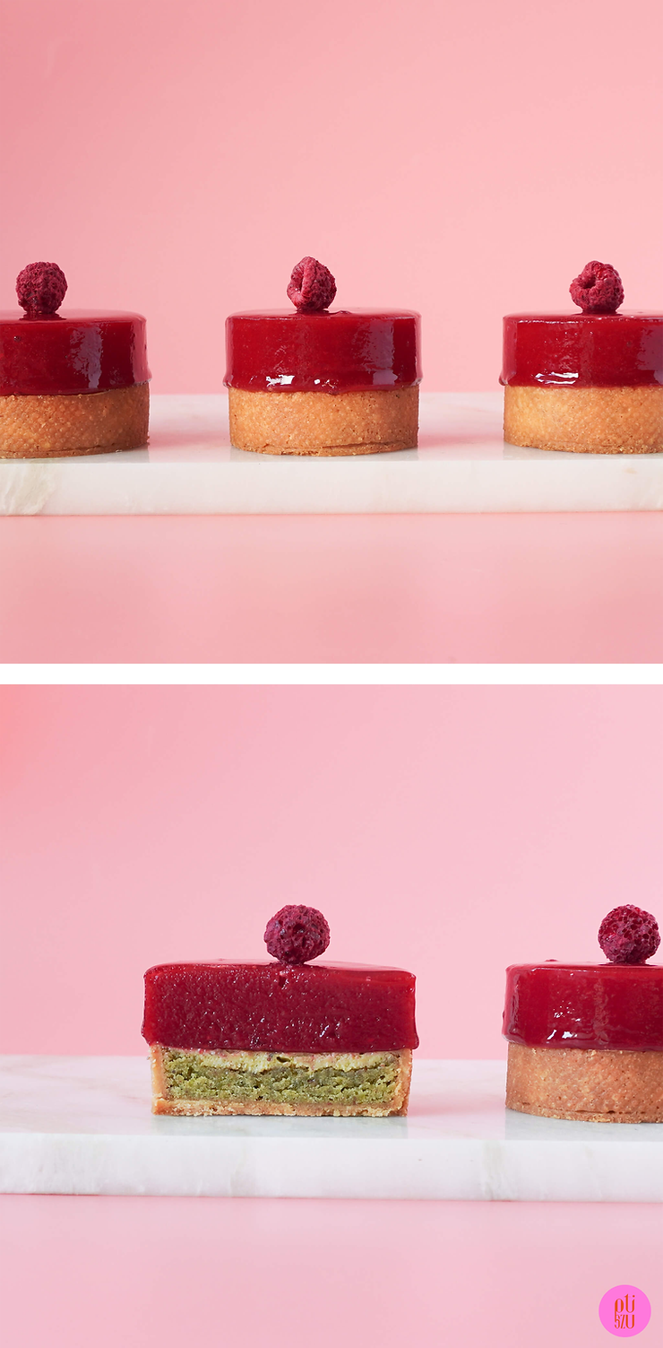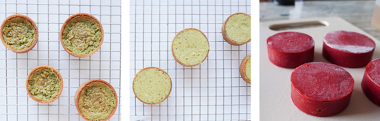 Dzień 1. – przygotowanie ciasta kruchego na korpusy, galaretki malinowej, zapiekanego kremu pistacjowego, glazury neutralnej (przepis znajdziesz tutaj)