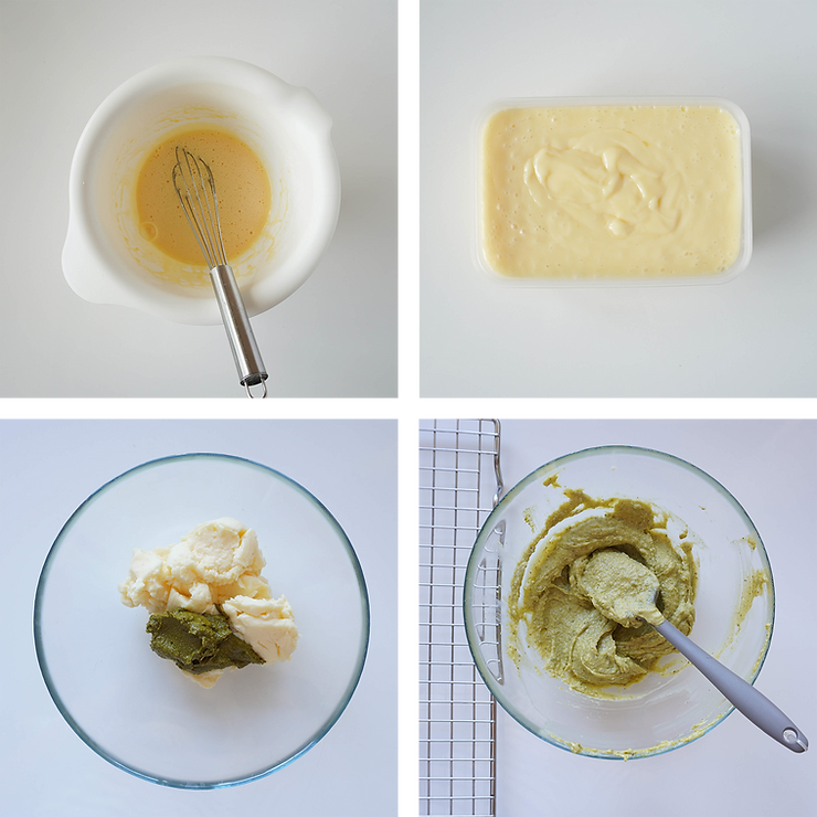 Podgrzewaj na małej mocy, nieustannie mieszając szpatułą. Kiedy krem osiągnie temperaturę 82°C, dodaj napęczniałą żelatynę, wymieszaj do całkowitego rozpuszczenia. Dorzuć masło i zblenduj. Dorzuć pastę pistacjowąPrzelej do miski i zabezpiecz folią w kontakcie. Odstaw do całkowitego wystudze i wymieszaj. Krem możesz użyć zaraz po przygotowaniu lub odstawić do lodówki. Przed użyciem dokładnie wymieszaj krem.