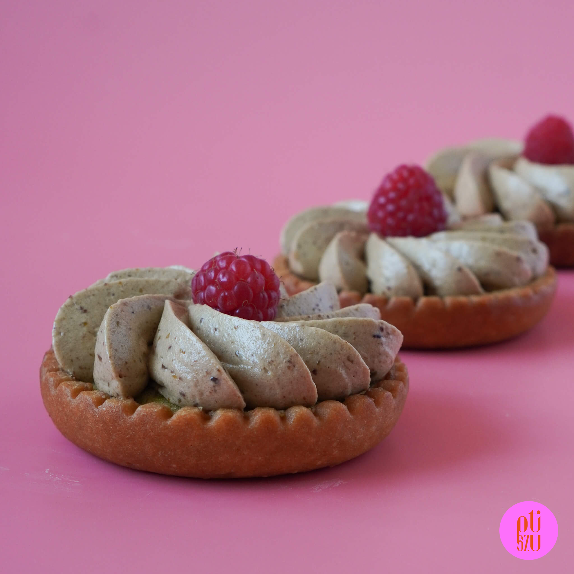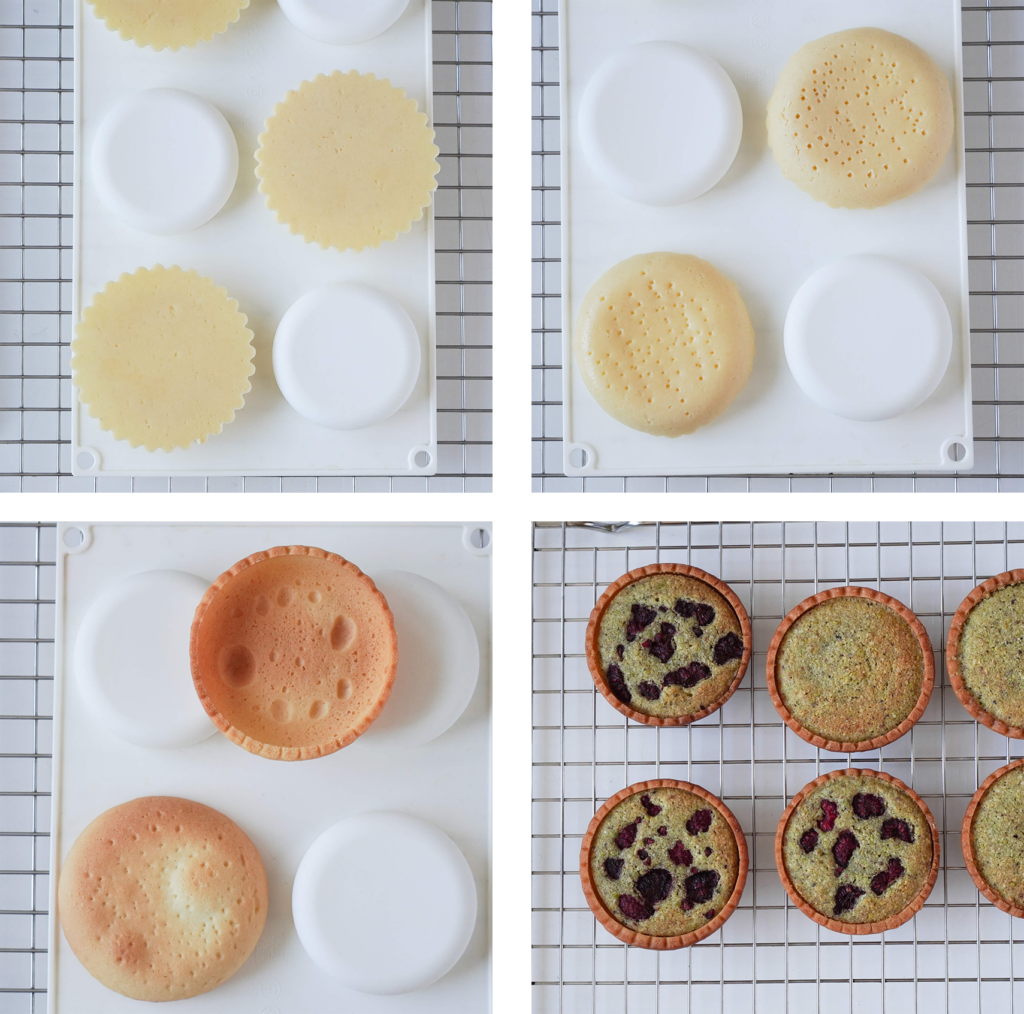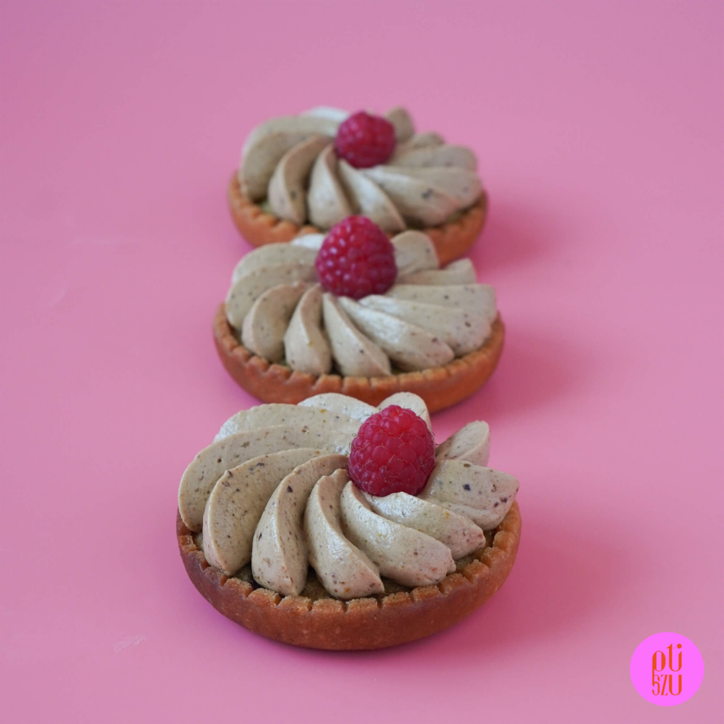 Tartaletki pieczone do góry nogami, na formie silikonowej do monoporcji? Czy to ma szansę się udać? Pewnie! Tak przygotowane korpusy prezentują się wyjątkowo dobrze i są o wiele łatwiejsze w przygotowaniu niż klasyczne tartaletki, pieczone w ringach perforowanych. Do tego zapiekany krem migdałowo-pistacjowy z malinami. A do dekoracji krem z muscovado i pistacjami, który dobrze się szprycuje… i jest pyszny!