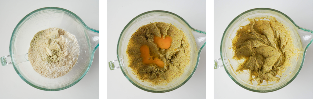 Do masła z cukrem dodaj jaja, mąkę migdałową oraz mieszankę mąki tortowej i pistacji. Mieszaj składniki do połączenia.