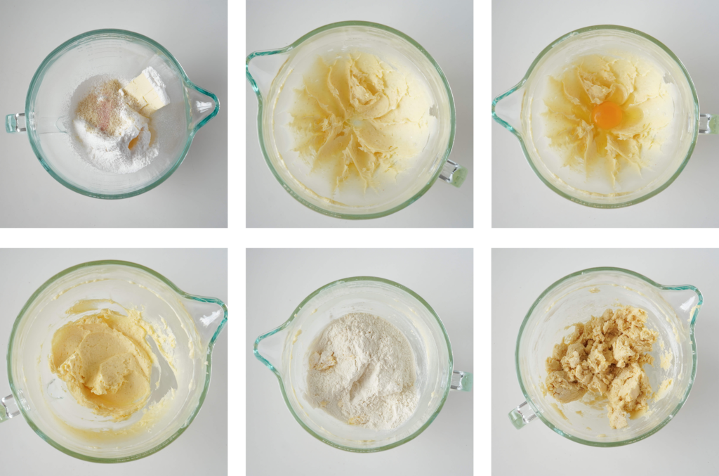 Masło, cukier puder, mąkę migdałową i sól umieść w czaszy miksera. Mieszaj całość (końcówka „K”) do całkowitego połączenia składników. Masa powinna być jednorodna.