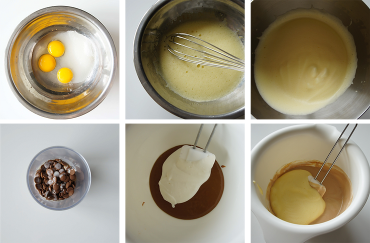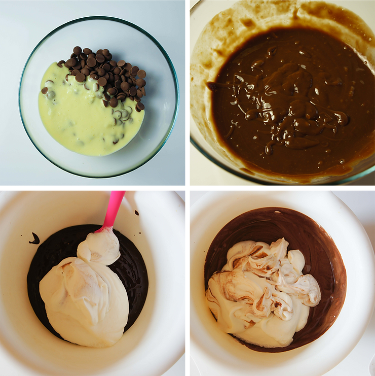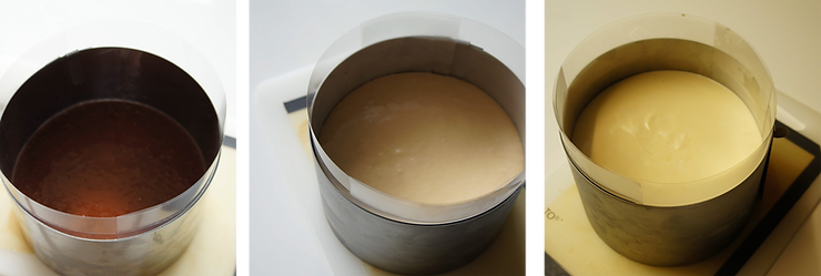 Podbij śmietankę B do miękkich wierzchołków i połącz w trzech turach z ganache. Następnie dodaj pâte à bombe. Mieszaj delikatnie szpatułą. Wylej na zamrożony mus z gorzkiej czekolady. Odstaw do zamrażarki na trzy godziny.