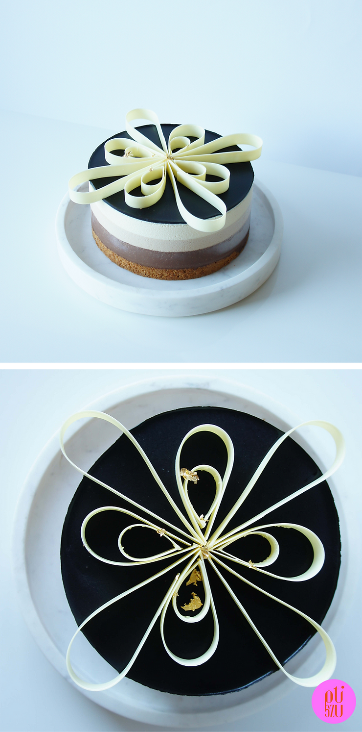 - Dzień 1.: biszkopt, mus z gorzkiej czekolady, ozdoba z czekolady, polewa lustrzana