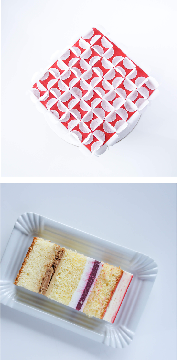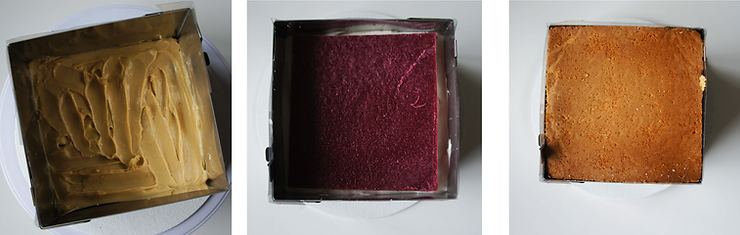 Wyciśnij odrobinę kremu na podkład. Rozsmaruj. Przykryj pierwszym blatem biszkoptowym. Następnie nasącz biszkopt ok. 40 ml syropu. Wyszprycuj połowę kremu sezamowego. Umieść na nim chrupkę i wyszprycuj pozostałą część kremu. Wyrównaj szpatułą. Przykryj kolejnym blatem biszkoptowym. Nasącz go i wyszprycuj połowę porcji musu kokosowego. Połóż żelkę z granatu i pozostałą część musu. Całość przykryj nasączonym blatem biszkoptowym. Przyciśnij i zabezpiecz folią od góry.