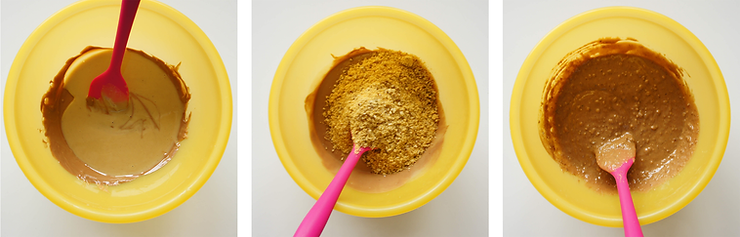 Dodaj masę żelatynową i wymieszaj. Następnie wylej na mieszankę czekoladową. Odczekaj minutę. Zblenduj do uzyskania masy o jednolitej konsystencji.