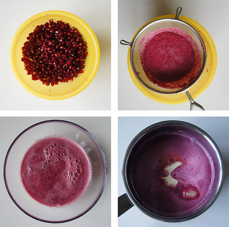 Pestki granatów zmiel w Thermomixie lub malakserze. Pozbądź się rozdrobnionych resztek, przelej sok przez sitko.