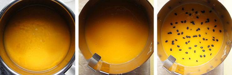 Puree z marakui i mango umieść w rondelku. Dodaj cukier z agarem, wymieszaj dokładnie. Zagotuj całość. Gotuj jeszcze minutę. Sok powinien lekko zgęstnieć. Po tym poznasz czy agar był dobrej jakości.